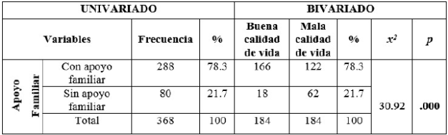 El presente estudio revela que la mitad de los adultos mayores presenta buena calidad de vida y tiene asociación con apoyo familiar, resultado similar a lo encontrado por Alfonso y et al. Quien encontró una relación positiva entre calidad de vida y apoyo familiar en el año 201612.