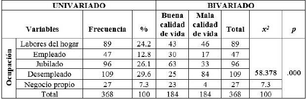 De igual forma se encontró que los desempleados presentan mala calidad de vida en 22.8%, encontrando asociación entre las variables con una X2 de 58.378, siendo estadísticamente significativa con una p: .000. (Tabla 2)