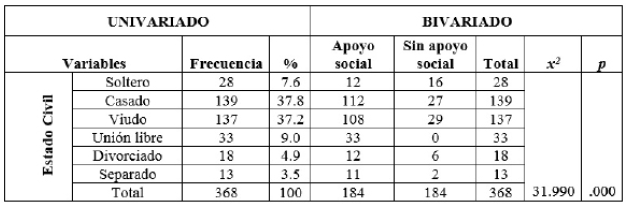 El grupo de casados presenta 30.4% apoyo social, siguiéndole los viudos con 29.3%, encontrando asociación entre las variables con X2 de 31.99, siendo estadísticamente significativa con una p: .000. (Tabla 5)