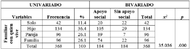 Respecto al familiar con quien vive el adulto mayor, se encontró que 28.5%, que vive con un hijo presenta apoyo social, por lo tanto, existe asociación entre las variables con X2 de 35.036 y con significancia estadística con una p: .005 (Tabla 6).