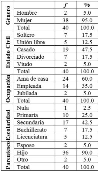 La edad promedio de los cuidadores primarios fue de 49 años, con una edad mínima de 34 y una máxima de 64 con un rango de diferencia de 30 años; existió una desviación estándar de 8.155. Casi la totalidad de los cuidadores fueron mujeres, en 95 % y sólo dos cuidadores hombres que corresponden a 5 %; el grupo de casados se reportó en 47.5 %, seguidos de los cuidadores solteros y divorciados con 17.5 % en cada grupo. 12.5% refirió estar en unión libre, y 5 % perdió a su pareja sentimental; más de la mitad, 60% de los cuidadores se encuentran en vida conyugal, mientras que el estado civil “separados”, se reporta en 40 %; en cuanto a la ocupación, las amas de casa ocuparon el 60 % y 40 % restante labora en instituciones o por cuenta propia; de éstos cuidadores, con una escolaridad de secundaria, correspondieron al 42.5 % (f=17) y con primaria completa 25 % (f=10); en cuanto al parentesco, los hijos representaron 90 % de los cuidadores de adultos mayores y solo 5 % fueron esposas, los otros dos restantes se identificaron como nieto y vecino, incluyéndose en el grupo de red de apoyo (Tabla 1).