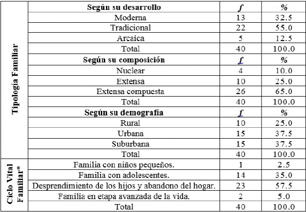 En las variables de familia, los cuidadores primarios se identificaron por la tipología según su desarrollo como tradicionales en 55 %, mientras 32.5 % como modernas y 12.5 % como arcaicas; según su composición 65 % fueron familias extensas compuestas con un número de integrantes por familia de hasta 8 personas, sólo 10 % de los cuidadores refirieron vivir con sus padres y sin pareja como familias nucleares. Por su demografía se obtuvo una cifra similar con 37.5 % en familias urbanas y suburbanas respectivamente. En el modelo del ciclo vital familiar de Carter y McGoldrick, 57.5 % se posicionaron en la etapa de desprendimiento de los hijos y abandono del hogar, seguidos por 35 % los que se ubicaron en familias con adolescentes, 5 % en familias en etapa de edad avanzada y solo 2.5 % en familias con niños pequeños (tabla 2).