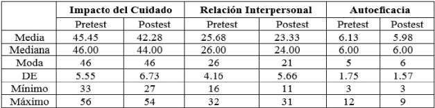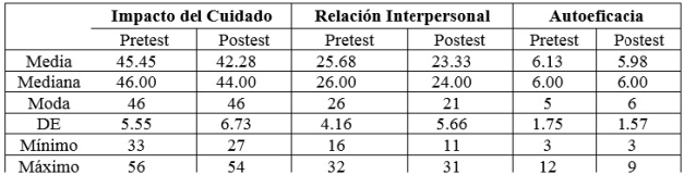 Por frecuencias y porcentajes, los factores que intervinieron en la sobrecarga de los cuidadores primarios de esta unidad por dimensiones, se mostraron con un gran descenso en el cansancio por las responsabilidades del cuidado del adulto mayor del 80 % al 25 %, así como el uso de redes de apoyo con una mejora del 70 % al 20 % que se relaciona con la percepción de ser el cuidador único con un descenso de 60 al 15 %, una mejor organización de planes a futuro y la disminución en la percepción de la sobrecarga. En la dimensión de relación interpersonal de igual manera se observó un descenso en la percepción de las exigencias del adulto mayor del 75 al 25 %, y una mejor relación del cuidador primario con el resto de sus familiares con 60 al 20 %, así como una mejor capacidad para resolver conflictos. Sin embargo en la autoeficacia, fue la dimensión que tuvo menos efectos, con un aumento en la percepción de las dificultades económicas para cubrir las necesidades del cuidado con 65 %, se registró una mejora en la concientización de que se debe hacer más por el paciente pero el no saber cómo aumentó.