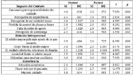Results: The caregiver profile was described as a woman, housewife, with an average age of 49, of a traditional and composite extended family, 100 % presented severe overburden in the pretest, after the intervention with cognitive-behavioral therapy the overburden reduced to a slight 25 % and a 5 % to a non overburden, with a statistical significance (p = .000) in the dimensions of care impact and interpersonal relationship, however in self- efficacy there was no such effect.