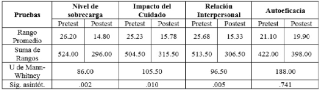 Se utilizó la prueba estadística U de Mann Whitney (tabla 6) comparando los valores obtenidos en el grupo experimental durante el pre test con el pos test, corroborando el efecto generado por la terapia cognitivo-conductual en los cuidadores primarios, al igual que con la prueba t éste efecto se observó en la puntuación general de la sobrecarga con una significancia de .002, en las dimensiones de impacto del cuidado y de relación interpersonal con significancias de .010 y .005 respectivamente, mientras que en la dimensión de autoeficacia también se mostró con una significancia mayor al 0.05 (p=.741).