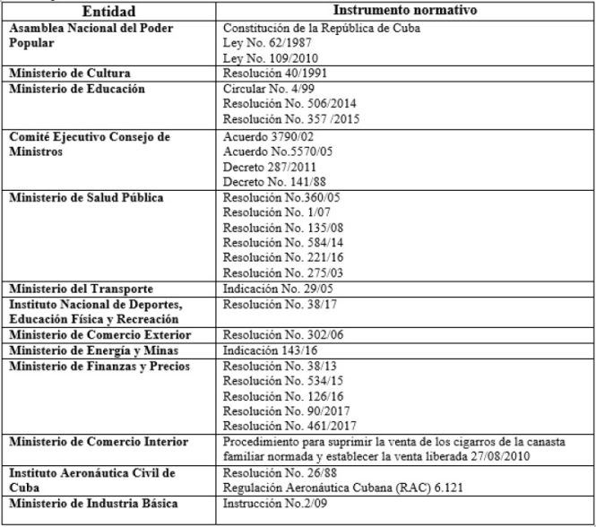En Cuba, de 1976 al 2017, se establecieron 29 instrumentos jurídicos, de los cuales cinco fueron aprobados por la Asamblea Nacional del Poder Popular (ANPP); dos por el Comité Ejecutivo del Consejo de Ministros (CECM), ya que tienen alcance nacional y 22 corresponden a Organismos de la Administración Central del Estado (OACE), dado que su alcance se limita a ellos. El “Procedimiento para suprimir la venta de los cigarros de la canasta familiar normada y establecer la venta liberada” aunque su aplicación corresponde al Ministerio de Comercio Interior, fue derivado de un acuerdo del Consejo de Ministros, dada la magnitud de la medida y su alcance. El instrumento jurídico de mayor rango lo constituye el Acuerdo No.5570/05 del CECM.