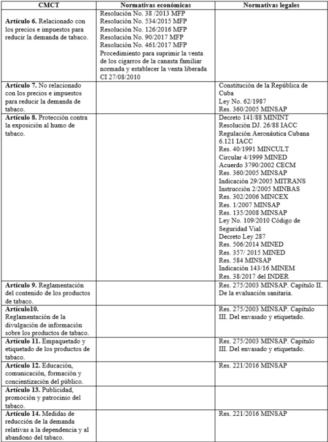 Cuba cuenta con numerosas normas jurídicas que se relacionan con todos los artículos del CMCT de la OMS para la reducción de la demanda, las que se encuentran en diversos instrumentos, con excepción del Artículo 13: Publicidad, promoción y patrocinio del tabaco. De acuerdo a las categorías de análisis de contenido, del total, solo hay seis instrumentos jurídicos con medidas económicas y éstas no han tenido como propósito fundamental la prevención y control del tabaquismo, sino que han respondido a intereses de la economía nacional.