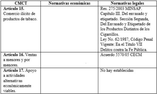 Como se ha presentado en los resultados de esta investigación, Cuba cuenta con numerosas normas jurídicas que se relacionan con los artículos del CMCT - OMS, que aun estando dispersas, pudieran tener un efecto mayor si se controlaran, de manera adecuada, su implementación y cumplimiento 24.