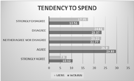 According to the results shown in figure 1, the 40.35% of women are "agree" and "totally agree" in considering themselves with "tendency to spend", in the case of men, the result is 34.8% in this category; to do in this construct the Pearson’s Chi-square test, it was obtained as a result 7 squares (16.7%) with a lower count than 5, the expected minimum count was 1.62; therefore, the hypothesis is accepted because significant differences are found, being women who frequently identify themselves with the "tendency to spend".