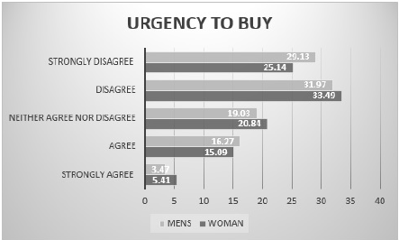 According to the results shown in figure 2, the 20.49% of women are "agree" and "strongly agree" in considering themselves with "urgency of buying", in the case of men the result was 19.74%, it is observed that there is a little significant difference between both genders. When submitting this construct to the Pearson’s Chi-square test, it was observed that 103 squares (39.9%) obtained a count less than 5, the minimum expected count was .41; therefore, the second hypothesis is rejected since the difference is not significant between men and women in terms of the "Urgency of buying".