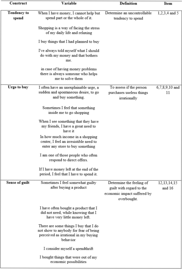 The table 1shows the definition and implementation of all the variables considered in each of the three constructs that represent the measuring instrument; also, the objective of each construct is defined, and its associated items.