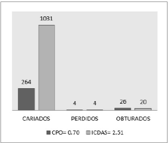 En dentición permanente, al seguir criterios convencionales del CPO, se determinaron 264 dientes cariados, 4 perdidos y 26 obturados, estableciéndose un índice CPO-D de 0.70. En la misma dentición, ICDAS determinó 1,031 dientes cariados, 4 perdidos y 20 obturados, estableciéndose un CPO-D modificado con ICDAS de 2.51 (Ver tabla 1 y tabla 2; figura 1).