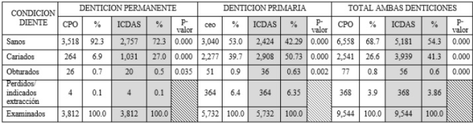 Se estableció con CPO que el 92.38% (3,518) de dientes permanentes y el 53% (3,040) de dientes primarios, estaban sanos, haciendo un total en ambas denticiones, del 68.7% de dientes sanos. En tanto con ICDAS, se determinó que el 72.3% (2,757) de dientes permanentes y el 42.29% (2,424) de dientes primarios, estaban sanos; en total, el 54.3% de dientes examinados, no presentaban caries (Ver tabla 1).