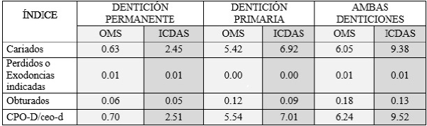 En ambas denticiones, CPO-D/ceo-d convencional, estableció una prevalencia del 31.3%; mientras que el CPO-D/ceo-d modificado con ICDAS, fue de 45.76%. Al evaluar las medias de dientes cariados, a través de la prueba T de Student y la de Levene, se encontró que la diferencia entre índices es significativa en dientes permanentes y primarios (p<0.05).