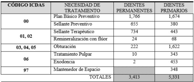 En cuanto a las necesidades de tratamiento por caries, con criterios CPO, se reflejaron 234 necesidades curativas para la dentición permanente y 2,763, para la primaria; cabe destacar que no es posible con estos criterios establecer acciones de atención preventivas. En cambio ICDAS, sí reflejó 2,421 necesidades preventivas para la dentición permanente y 2,054, para la primaria. Además, 992 curativas para permanentes y 3,277 para primarios. (Ver tabla 3 y tabla 4)