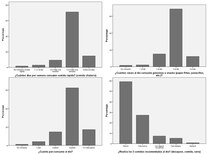 Así mismo, en el presente estudio se identificó que una gran proporción de los escolares ingerían comida chatarra con mucha frecuencia (5 a 6 días a la semana), este resultado fue similar al de otros investigadores, quienes identificaron que sus participantes tenían un consumo elevado de este tipo de alimentos, dado que los consumían al menos tres veces por semana1; así mismo, otros investigadores encontraron que sus participantes registraron un alto consumo diario de papas fritas y hamburguesas, así como de golosinas dulces y saladas; además de una ingesta diaria de pan durante el almuerzo24, al igual que en la presente investigación, donde la ingesta de pan dulce generalmente fue de tres piezas al día.
