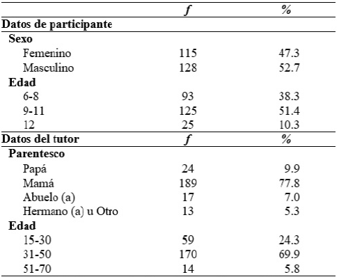 El instrumento permitió clasificar por tres puntos de corte de acuerdo a percentiles, 1) <P25= Conducta y hábitos alimentarios deficientes; 2) P25 - P75= Conducta y hábitos alimentarios suficientes y 3) >P75= Conducta y hábitos alimentarios saludables. El instrumento ha presentado buena consistencia interna con Alpha de Cronbach de .79. Para este estudio se contó con la autorización de los directivos de la escuela primaria Francisco Zarco, se solicitó la lista de los alumnos inscritos en el ciclo escolar para identificar el tamaño de la población y posteriormente se determinó un tamaño muestral de 265 escolares. No obstante, al citar a los padres de familia, algunos no asistieron a las juntas, por lo que al final se conservaron únicamente 243 participantes, los cuales fueron considerados para el análisis de resultados.