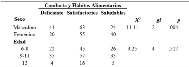 Resultados: 52.7% fueron de sexo masculino, 48.6% presentaron conducta y hábitos alimentarios suficientes. El sexo masculino presentó una relación con la conducta y los hábitos alimentarios (X2=11.11, p=.004), así como efecto predictivo (p= .307, F[1-241]= 11.516, p< .01).