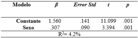Posteriormente se realizó un análisis de correlación entre las variables sociodemográficas de los escolares por medio del estadístico Chi cuadrado y se determinó que la variable sexo, presentó significancia estadística con respecto a la conducta y lo hábitos alimentarios; esto indica que el sexo masculino se relaciona con menores conductas y hábitos saludables (Tabla 2). Posterior al análisis de correlación, se procedió a realizar un análisis de regresión lineal, con el fin de verificar si además de una relación, existía un valor predictivo del sexo sobre la conducta y los hábitos alimentarios; de acuerdo con esto, el modelo presentó significancia estadística, por lo que fue posible comprobar dicho efecto predictivo (F[1-241]= 11.516, p< .01). Los detalles se observan en la Tabla 3.