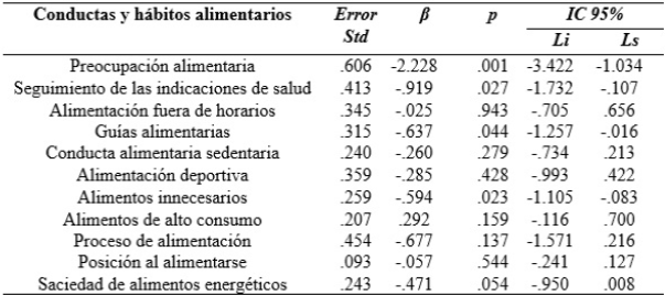 Por último, para brindar un efecto predictivo más detallado, se realizó un análisis de regresión sobre las diferentes dimensiones del instrumento; esto permitió determinar que los escolares de sexo masculino tienen mayores probabilidades de presentar efectos predictivos sobre múltiples conductas y hábitos alimentarios, como menor preocupación alimentaria.