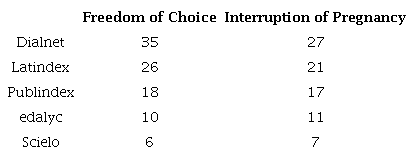 During the period between 2010 and 2019, a documentary study was carried out with a sample of sources indexed to repositories in Latin America: Dialnet, Publindex, Latindex, Scielo and Redalyc, following the information of the keyword search criteria. Freedom of choice, sexual and reproductive rights and interruption of pregnancy.