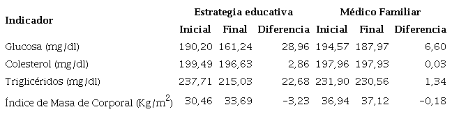 Resultados de un estudio realizado en una institución de primer contacto para pacientes con Diabetes en México (Tabla 2), para evaluar coste-efectividad de la atención del paciente con diabetes mellitus tipo 2 manejado por el médico familiar versus estrategia educativa. Se usaron dos grupos de estudios el primero integrado por pacientes insertos en una estrategia educativa (participación del médico familiar, enfermera, trabajadora social, nutricionista y familiares) y el segundo atendidos por un médico familiar (atención mensual del médico familiar en el consultorio). La glucosa inicial en el grupo de estrategia educativa fue de 190,20 mg/ dl, y en el grupo atendido por médico familiar de 194,57 mg/dl (p=0,61); los valores finales en cada grupo fueron 161,24 mg/ dl y 187,97 mg/dl (p=0,00) respectivamente. En el primer grupo el descenso fue de 28,96 mg/dl (p=0,00) y en el segundo de 6,60 mg/dl (p=0,18). En cuanto al análisis de coste-efectividad se encontró que por cada 100 $US invertidos se desciende 10,42 mg/dl en la alternativa estrategia educativa y 2,57 mg/dl en la estrategia médico familiar.13 (Tabla 2).