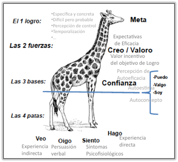 Por último, las cuatro “patas”, que hacen referencia a las vías de información o de experiencia mediante las cuales se afecta a la autoconfianza (“cuerpo”). En primer lugar, está la pata del “hago”, que es la experiencia directa que ha tenido la persona en la consecución de metas con elementos similares. Después, la pata “veo”, que hace referencia a la experiencia vicaria u observacional (lo que ve la persona de sí misma reflejado en los demás) y la pata “oigo”, que son los mensajes que recibe la persona tanto de sí misma como de los demás acerca de su meta y su capacidad para lograrla. Por último, está la pata “siento”, que hace referencia a la interpretación, en términos de eficacia percibida, de los síntomas psicofisiológicos corporales y emocionales que la persona experimenta al plantearse su meta. (Figura 1)