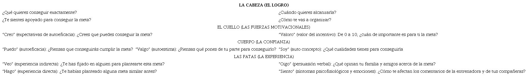 Como base para la intervención, se utilizó el modelo de coaching motivacional “La Jirafa de Cantón,”33,34 que está formado por cuatro componentes reflejados metafóricamente en la figura de una jirafa (Figura 1), siendo el primero de ellos la “cabeza” que hace referencia al objetivo o meta que se quiere lograr, la cual debe estar dividida en sub metas más fácilmente alcanzables, ser flexible, concreta y suponer un reto manejable para la persona, entre otras características de las metas adecuadamente planteadas.