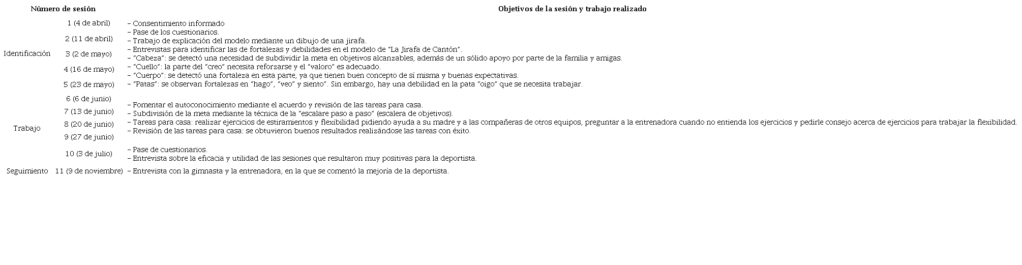 Tras hablar telefónicamente con la familia de la deportista, se acuerda con ésta, la entrenadora y la propia deportista, que se realizaría la intervención. (Tabla 2)