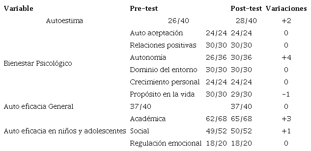 Con respecto a las puntuaciones en la “Escala de Auto eficacia General”, se mantuvieron altas, tanto antes como después de la intervención (37 puntos en ambos casos), aunque cabe destacar que hubo un aumento en las puntuaciones del ítem 5 (“Gracias a mis cualidades y recursos puedo superar situaciones imprevistas”) y el 7 (“Venga lo que venga por lo general soy capaz de manejarlo”). Todo esto indicó que las sesiones realizadas habían tenido un efecto positivo sobre la percepción de autoeficacia a la hora de enfrentar posibles dificultades en el cumplimiento de la meta.
