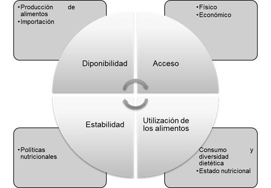 La seguridad alimentaria engloba varios aspectos, en primer lugar que exista disponibilidad de la oferta de alimentos tanto en el ámbito nacional como local; segundo que los hogares tengan acceso físico y económico a estos alimentos, además que los jefes de familia así como los encargados de la preparación de los alimentos, tengan los cocimientos necesarios para asegurar que cada miembro de la familia cubra sus necesidades nutricionales. Por último, que lo anterior se presente en todo momento; por lo cual el Consejo Nacional de Evaluación de la Política de Desarrollo Social (CONEVAL), utiliza cuatro dimensiones para la evaluación de la seguridad alimentaria: disponibilidad, acceso, utilización de los alimentos y estabilidad en todo momento5. (Figura 1)