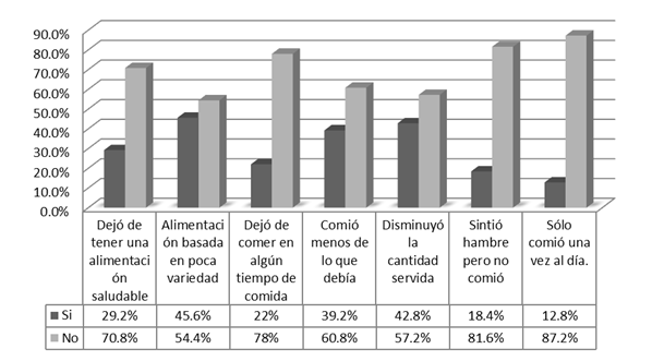78.8% sintió preocupación porque los alimentos se acabarían (Figura 2), 36% manifestaron que se quedaron sin alimentos en su hogar en alguna ocasión durante el periodo mencionado anteriormente. Además, en 29.2% de estos hogares, algún menor dejó de tener una alimentación saludable, 45.6% tuvo una alimentación basada en poca variedad de alimentos, y 22% dejó de comer en algún tiempo de comida; mientras que 39.2% comió menos de lo que debía comer. 42.8% refirió haber disminuido la cantidad servida de alimentos, y en 18.4% algún menor sintió hambre, pero no comió; mientras 12.8% solamente comió una vez al día o dejó de comer durante todo el día (Figura 3).