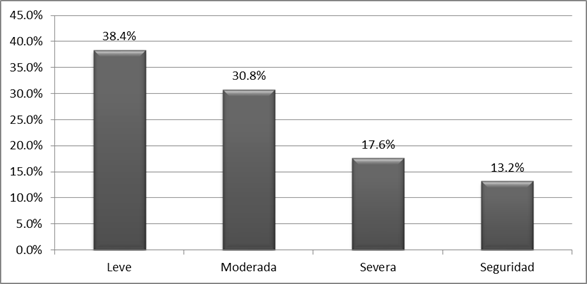 De acuerdo al número de preguntas cuyas respuestas fueron afirmativas en la ELCSA se llevó a cabo el diagnóstico de seguridad alimentaria de las familias estudiadas, de las cuales, la mayoría (86.8%) se encuentran en algún nivel de inseguridad alimentaria y únicamente 13.2 % cuenta con seguridad alimentaria (Figura 4). 38.4% se encuentran con inseguridad alimentaria leve, 30% con inseguridad moderada y 17.6% con inseguridad severa (Figura 5).