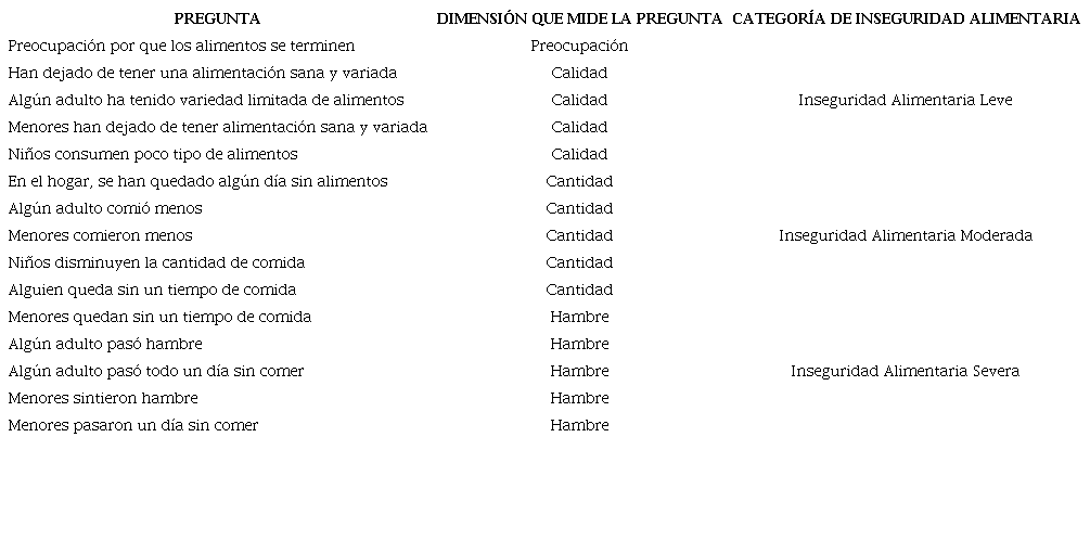 El instrumento empleado para la evaluación de la seguridad alimentaria fue la Escala Latinoamericana y Caribeña de Seguridad Alimentaria (ELCSA), que consta de 15 ítems cuyas respuesta es “Sí” con un valor de uno, o “No” con un valor de cero; e identifica tres niveles de inseguridad alimentaria: inseguridad alimentaria leve que se relacionan en primera instancia con la preocupación por el acceso a los alimentos, demeritando la calidad de la dieta; la moderada, la cual además de disminuir la calidad de los alimentos, refieren tener restricciones en la cantidad de los alimentos consumidos; y la severa, que además de las situaciones anteriores, presentan también experiencias de hambre8. (Tabla 1)