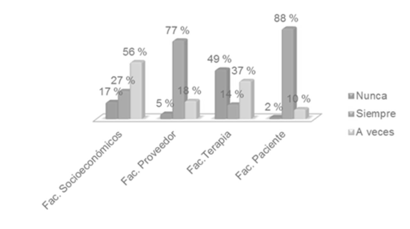 En cuanto al análisis de las cuatro dimensiones que influyen en el comportamiento de adherencia del paciente, quien tiene mayor impacto con 88 %, son los factores relacionados con el paciente, como lo reafirma Zambrano en 2012, refiriendo que las personas deben estar convencidas de la importancia de seguir con su tratamiento y 77 %, son los factores relacionados con el proveedor, como lo menciona Flórez en 2009. En su estudio, este factor constituye un gran potencial para influir en el comportamiento de adherencia; 56 % refieren que los factores socioeconómicos influyen en el comportamiento de adherencia, algo contradictorio a los resultados del estudio hecho por Zambrano en 2012, el cual menciona que los factores socioeconómicos tienen poca influencia en el comportamiento de adherencia; sin embargo, Flórez en 2009 menciona que estos factores influyen de manera positiva en el comportamiento de adherencia. Finalmente, con 46 % relacionados con la terapia, influye de forma positiva en el comportamiento de adherencia, similar a los resultados mostrados por Flórez en 200917,18.