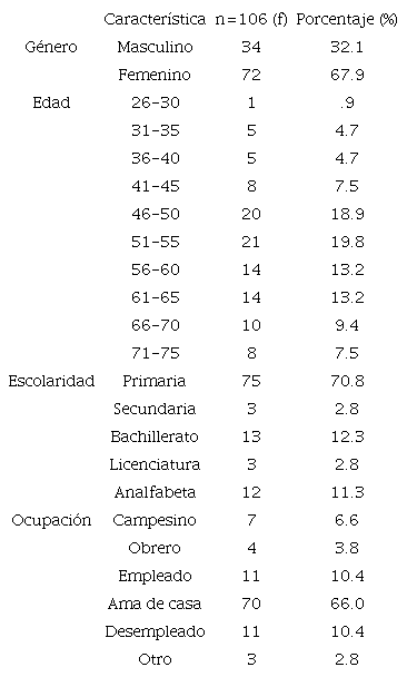 Se utilizó en el programa estadístico SPSS versión 21, el análisis de las variables edad, género, escolaridad, ocupación, tiempo de evolución, tiempo de llevar tratamiento en la Unidad de Especialidades, a través de estadísticos descriptivos, frecuencias; para las variables dependientes, técnica estadística descriptiva, frecuencias, medidas de tendencia central y porcentajes. Para analizar la variable edad, se utilizaron los rangos de acuerdo a la pirámide poblacional de la Secretaria de Salud Nacional, dividida en quinquenios, en un rango desde 26 a 30 años hasta 71 a 75 años.