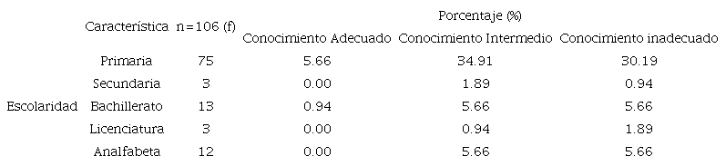 El nivel de conocimientos que tienen los pacientes en la Unidad de Especialidades de Enfermedades Crónicas, en relación a su enfermedad, es intermedio con 49.1 %; el 44.3 % con un conocimiento inadecuado y solo 6.6 % poseen un conocimiento adecuado, identificando los tres aspectos que evalúa el instrumento. Al cruzar las variables, en relación al conocimiento y el nivel de escolaridad, se observa que 34.91 % con un nivel de escolaridad primaria, cuentan con conocimiento intermedio, el 30.19 % refieren conocimiento inadecuado, y 5.66 % cuentan con conocimiento adecuado. Se hace mención que la mayor población estudiada refiere contar con nivel de escolaridad primaria, por lo cual, al realizar el cruce de las variables, se ve en mayor proporción en éste que en los demás. (Tabla 2)