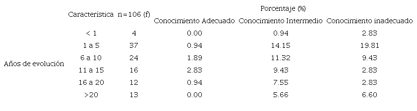 La relación de variables entre el nivel de conocimientos con los años de evolución de la enfermedad, se observa que los que tienen de 1 a 5 años con el padecimiento, 19.81 %, refieren tener un nivel de conocimientos inadecuado y 14.15 %, conocimiento intermedio; los pacientes que cuentan con más de 20 años de padecer la Diabetes Mellitus tipo 2, el 6.60 % poseen conocimiento inadecuado y 5.66 % cuentan con un conocimiento intermedio. (Tabla 3)