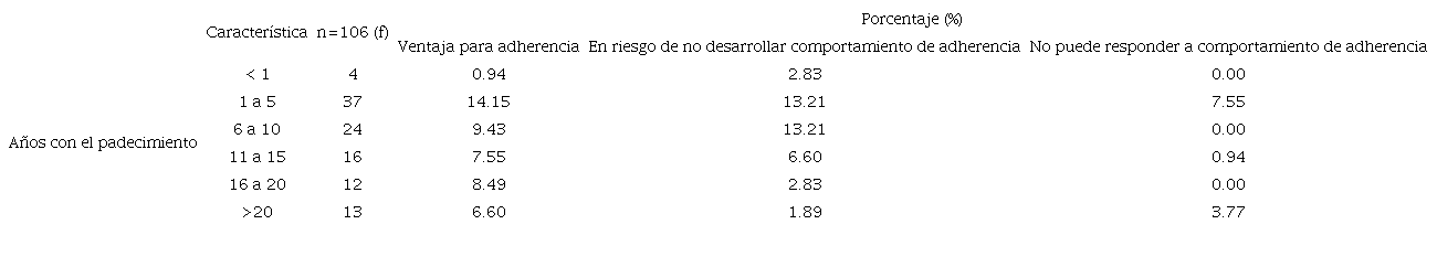 En cuanto a la relación entre el comportamiento de adherencia y los años de evolución del padecimiento, 14.15 % tienen ventaja de adherencia y 13.21 % tienen riesgo de no desarrollar comportamientos de adherencia; ambos con una evolución de la enfermedad de 1 a 5 años y el 7.55 % con estos mismos años de evolución refieren no responder a comportamiento de adherencia. (tabla 4)