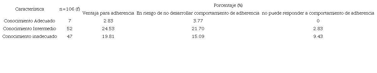Así mismo, al relacionar el nivel de conocimiento con el comportamiento de adherencia, se observa que los que cuentan con un nivel de conocimiento intermedio, 24.53 % tienen ventaja para adherencia y 21.70 % están en riesgo de no desarrollar comportamientos de adherencia. Los que poseen un nivel de conocimiento inadecuado, 19.81 %, tienen ventaja para adherencia y el 15.09 % se encuentra en riesgo de no desarrollar comportamientos de adherencia, siendo solo 9.43 % que no pueden responder a comportamientos de adherencia. (Tabla 5)