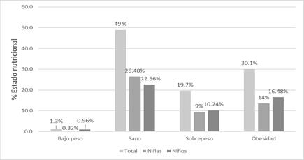 En la figura 1 se observa que el estado nutricional de los niños, al clasificarse de acuerdo al Z-IMC/E mostró que la prevalencia de malnutrición fue del 51% (sobrepeso 19.7%, obesidad 30.1% y bajo peso 1.3%). Solo el 49% presentó un normopeso. Con relación al estado nutricional por género, se observa que el 26.72% de los niños tienen mayores problemas de sobrepeso y obesidad en relación con el 23 % de las niñas.