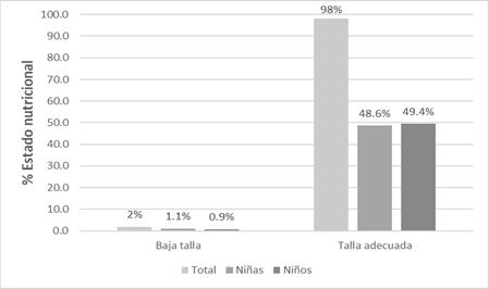 En la figura 2, se observa que el 98% de la población (48.6% niñas y 49.4% niños), presentan talla adecuada y solo el 2% presentó talla baja. Encontrándose que 9 de cada 10 presenta talla adecuada a su edad.