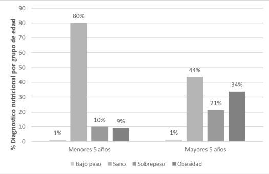 En la figura 3 se muestra el estado nutricional en dos grupos de edad de acuerdo con el Z-IMC/E. En la primera categoría los niños menores de 5 años presentaron una prevalencia de malnutrición del 49% y 37% con normopeso. En relación a los mayores de 5 años, un 12% presentó normopeso y la prevalencia de malnutrición fue del 2%.