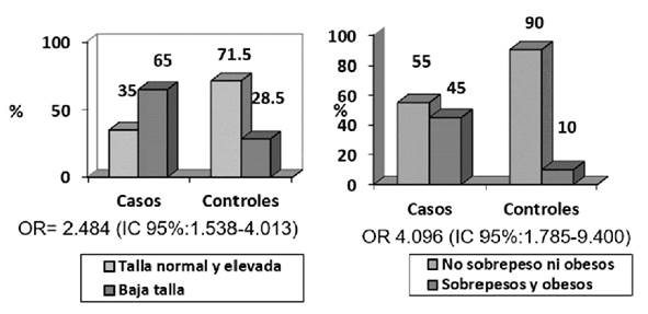 Resultados: El 45% del grupo de casos fueron evaluados como sobrepesos y obesos y el 65% de baja talla para su edad. Cumplir con una frecuencia de 6-7 veces por semana con el desayuno, almuerzo y las meriendas de mañana y tarde, se asoció al control. Los casos consumen más energía alimentaria que los controles, con la excepción de las vitaminas A y E, el ácido fólico y el calcio.