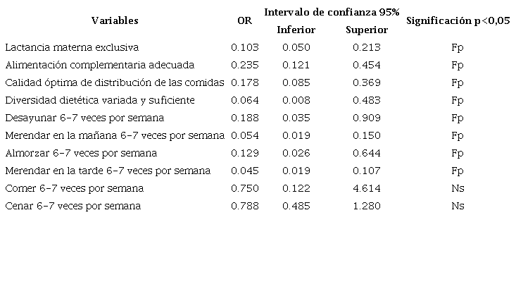 En la tabla 1 se presentan los resultados en relación con las características de la alimentación de los niños estudiados. Haber recibido lactancia materna exclusiva hasta los seis meses de edad y cumplir de manera adecuada con la introducción de la alimentación complementaria, según las Guías Nutricionales para la Población Cubana Menor de dos años de edad25, se comportaron como factores protectores (OR=0,103 para el primero y OR=0,235 en el caso del segundo). La calidad óptima de la distribución de las comidas durante el día (OR=0.178), así como la diversidad dietética semanal variada y suficiente (OR=0.064) se presentan como factores protectores para el control.