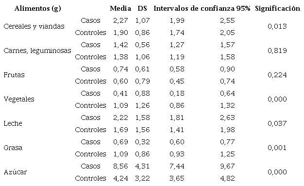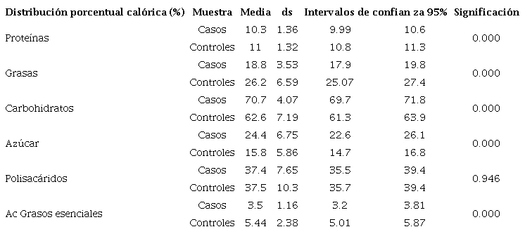 Respecto al consumo energético, aunque para ambos grupos fue superior que las recomendaciones nutricionales ponderadas de la población cubana por el Instituto de Nutrición e Higiene de los Alimentos, el autor considera necesario destacar que las diferencias encontradas entre los casos y controles fue significativa.