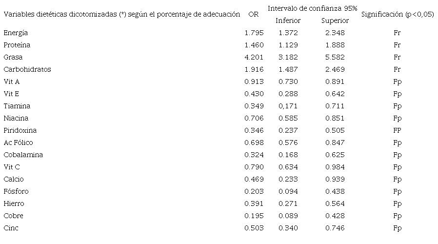 La Tabla 4 muestra la asociación de los porcentajes de adecuación de energía y nutrientes entre los casos y los controles. Los porcentajes de adecuación miden el grado (%) de cumplimiento del consumo de las variables dietéticas en relación con las recomendaciones dietéticas diarias de energía alimentaria, macro y micronutrientes estimadas de manera individual según el sexo y la edad de los encuestados. Es necesario recordar aquí que para la dicotomización de esta variable se consideró 110% como punto de corte para establecer un consumo excesivo de cada uno de ellos.