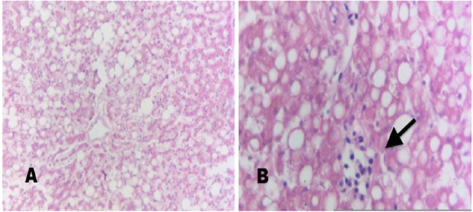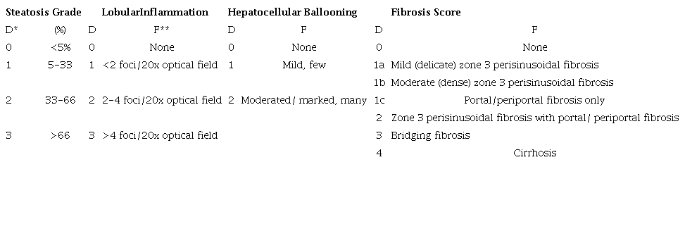 After measuring and weighing the liver, two1x1x1 cm, wedge biopsies were performed wedge biopsies corresponding to the lateral segment of left lobe and posterior segment of right lobe; subsequently, they were fixed with 4% buffered formalin for 24 hours. Hematoxylin & eosin and Masson’s trichrome stains were performed, and biopsies were analyzed with a light microscope by a certified pathologist according to the NASH CRN Scoring System table 1; with this score system, a NAS score of ≥ 5 correlates with a diagnosis of ‘‘definite NASH’’ whereas NAS ≤3 correlates with a diagnosis of ‘‘not NASH12.