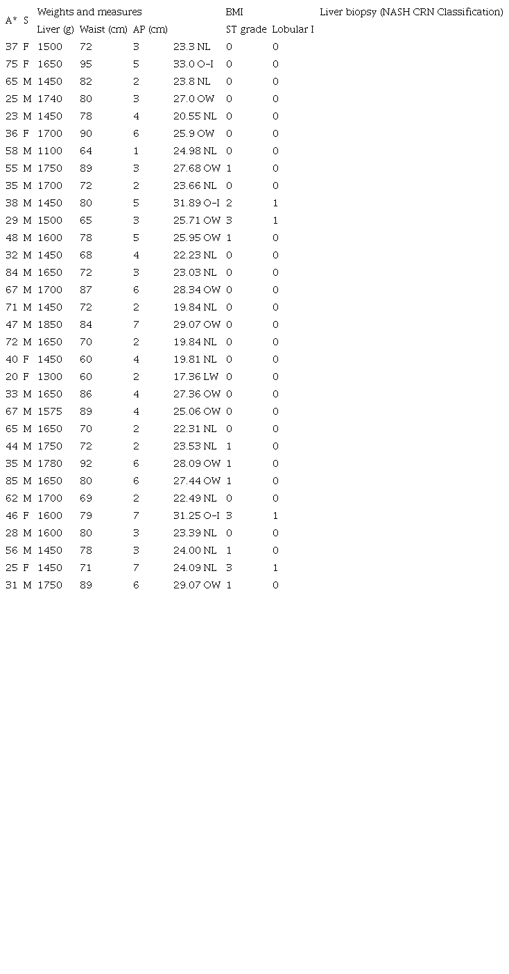 The thickness range of the adipose panicle was 1-7 cm, with the following distribution according to weight: normal weight, 1-4 cm (mode=2); overweight, 3-7 cm (mode= 6), and grade I obesity, 5-7 cm (mode= 5). The weight of the liver had a range of 1300 to 1850 g table 3.
