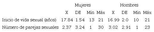 Respecto a la conducta previa relacionada (inicio de vida sexual y número de parejas sexuales), se identificó que los hombres iniciaron vida sexual antes que las mujeres y el número de parejas es mayor en ellos tabla 1.
